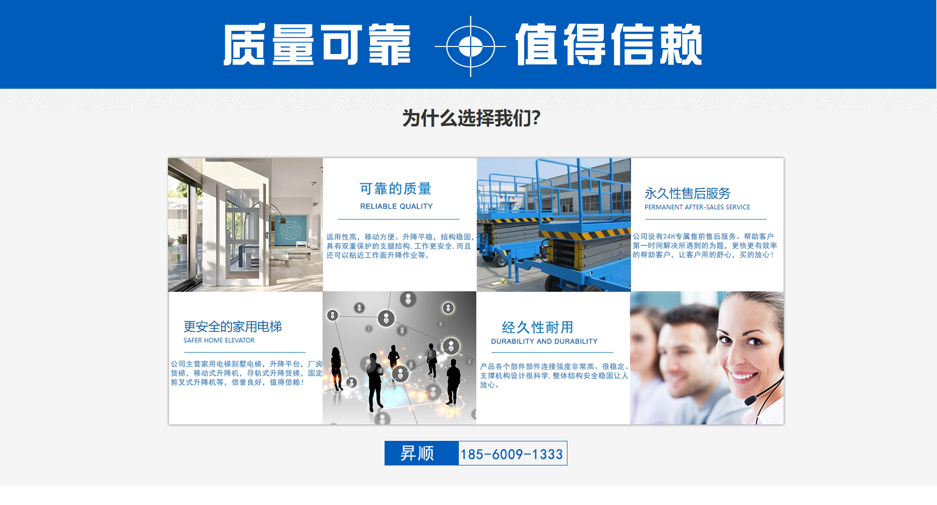 山東昇順液壓升降機械有限公司是一家主營家用電梯,別墅電梯,升降平臺,廠房貨梯,移動式升降機,導軌式升降貨梯,固定剪叉式升降機等產品企業,質量可靠,值得信賴?! ∮脩糁辽希杂脩魹橹行摹笔枪居肋h堅持的服務宗旨,贏得用戶的贊許是我們的榮譽,及時滿足用戶的需求,是我們公司的愿望。長期以來,公司員工以優質的服務,取悅于用戶,以誠信的言行取信于用戶,得到了用戶們的好評。我們期待著與您更加愉快的合作!公司的發展,離不開社會的大力支持,在社會的支持和幫助下,我們正昂首闊步邁向未來! 我們的經營方針是:以質量求生存,以產品求發展,以信譽保合作,以服務贏客戶?! ”竟緦Ξa品質量和各項服務恪守合同承諾,并愿與新老客戶精誠合作,共創未來?! 」揪瘢簞撔率侵黝},超越是不懈的追求。 公司宗旨:信譽保證,誠信為本?! ∥覀儠院侠淼膬r格,良好的信譽,雄厚的實力,優質的產品,最周到的服務,服務于廣大新老客戶!...